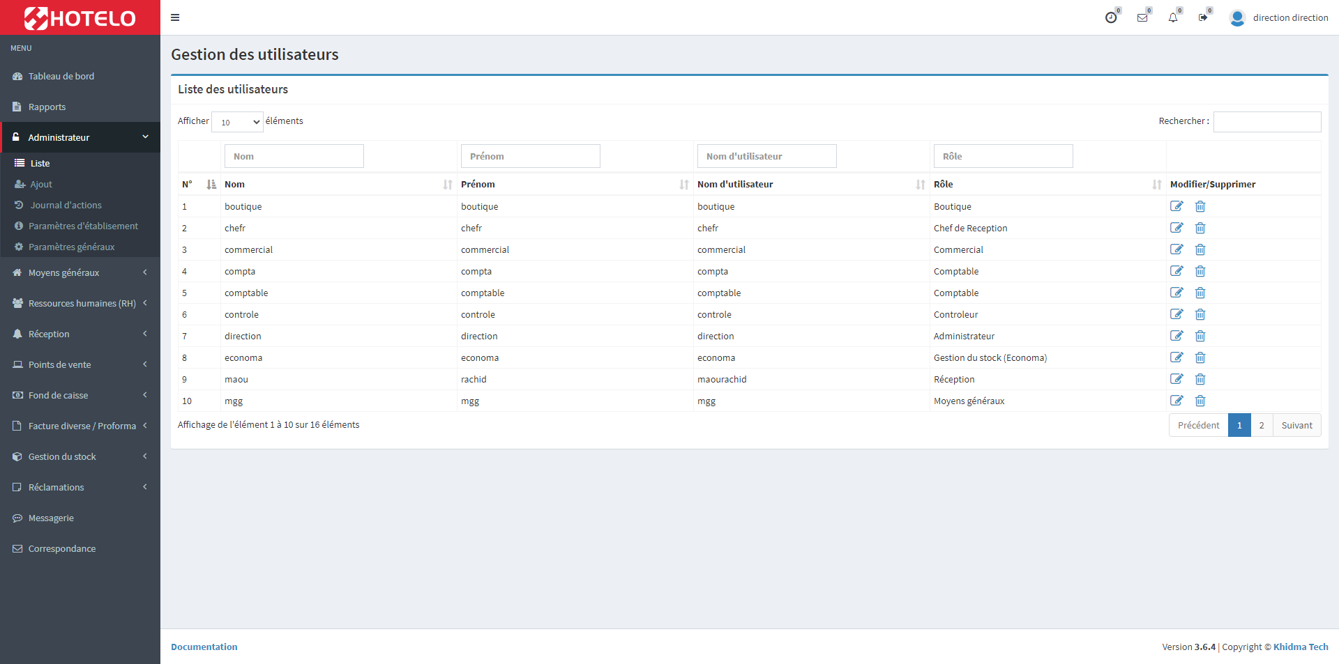 La liste des utilisateurs vous permet de parcourir les informations de tous les utilisateurs du PMS, de les modifier et de les supprimer.