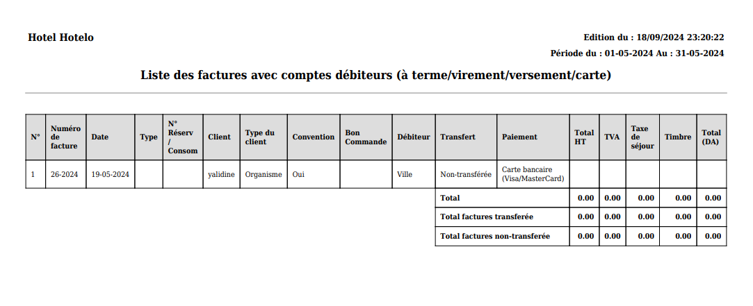 Liste des factures avec comptes débiteurs (à terme/virement/versement/carte)