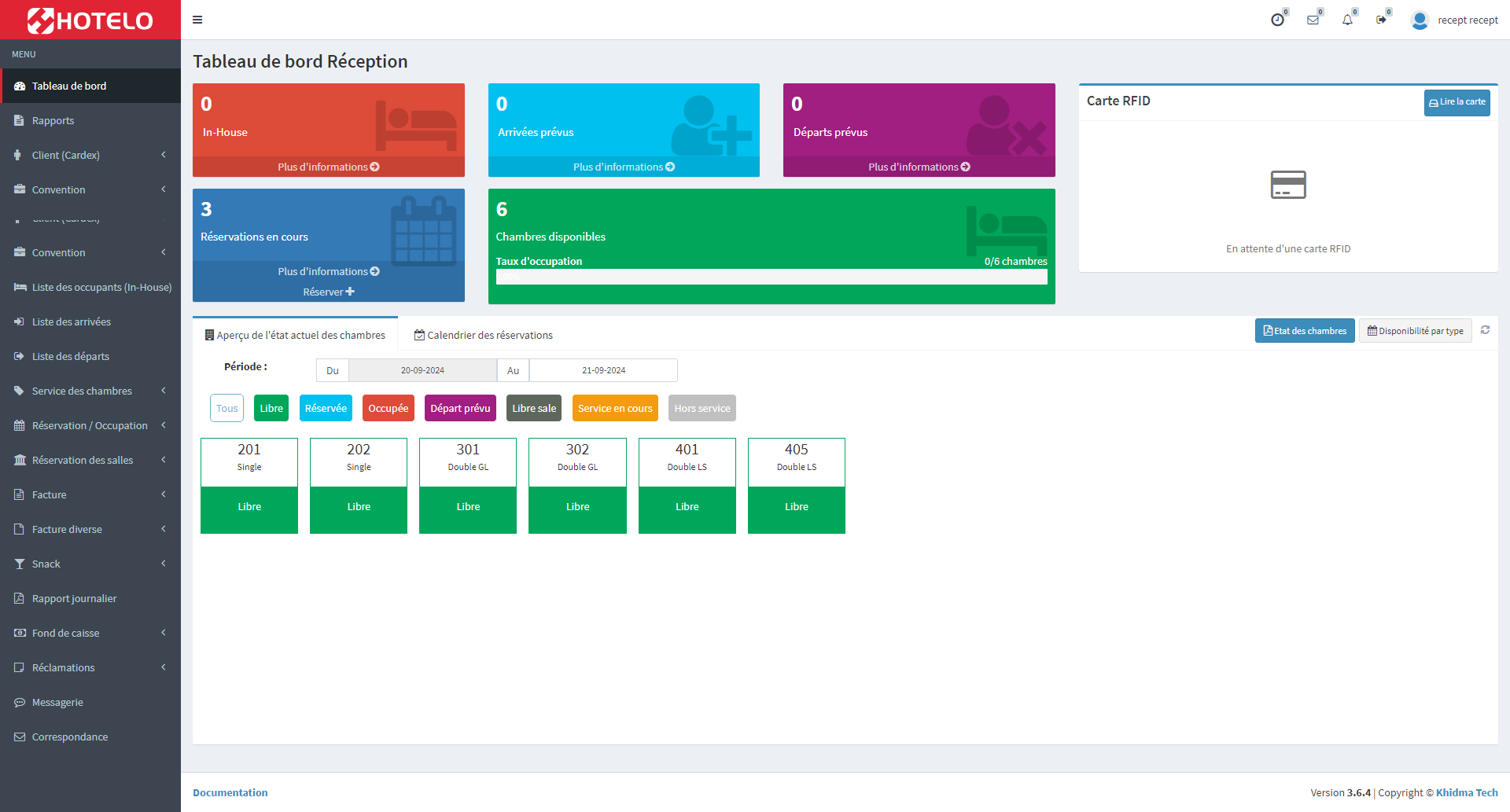Dans le tableau de bord du réceptionniste, il y a une vue générale sur les informations importantes et des raccourcis nécessaires pour mieu gérer les réservations et les occupations dans l'hôtel.