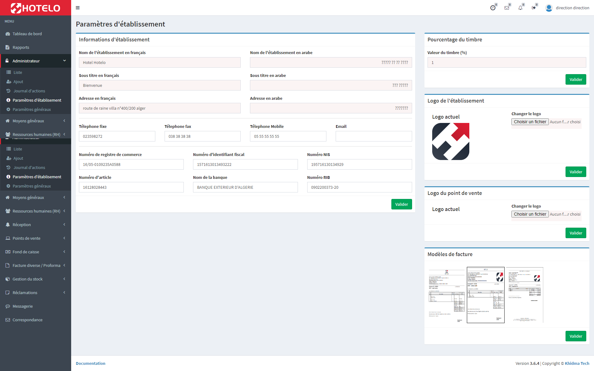 Le composant "Paramètre d'établissement" est l'endroit où les informations sur l'hôtel peuvent être modifiées, ces informations sont :