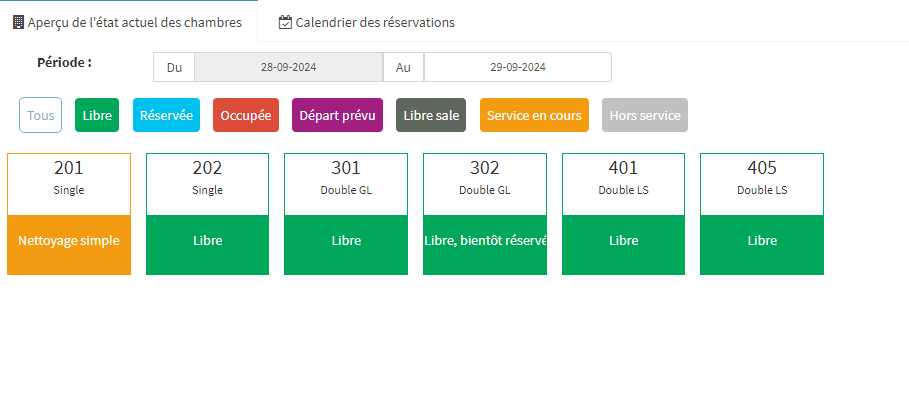 Dans le tableau de bord du réceptionniste, il y a une vue générale sur les informations importantes et des raccourcis nécessaires pour mieu gérer les réservations et les occupations dans l'hôtel.
